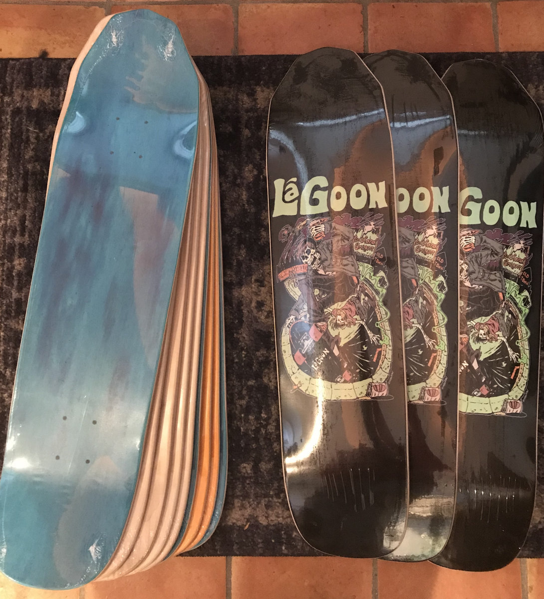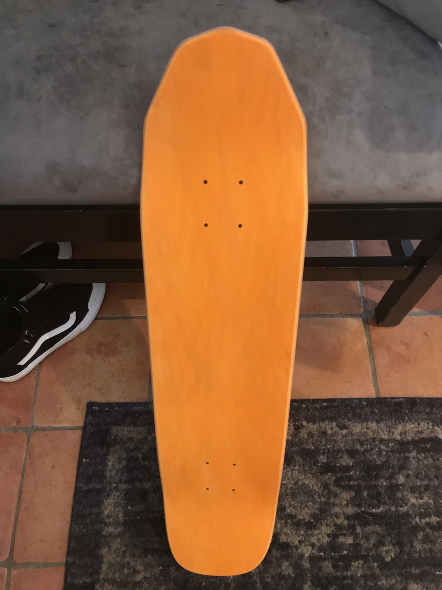 Custom coffin shaped deck with the Skate Fast Play Loud artwork by Rimba Wiwaha